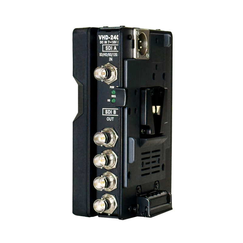 VHD-2400は1入力4分配×2系統の分配器です。超高速SDIである6G/12Gを含む映像デジタルのほぼ全て(SD-SDI/HD-SDI/6G-SDI/12G-SDI/DVB-ASI)に対応。ケーブル伝送ロスが著しい従来のBNCケーブルを使用した時など、衰下した信号を再取リクロックしてきれいな信号へ書き換え、本来の信号と同等レベルにして出力できます。